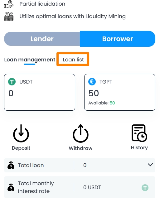 After you have completed deposit TGPT. Select Loan list to find a suitable lender.