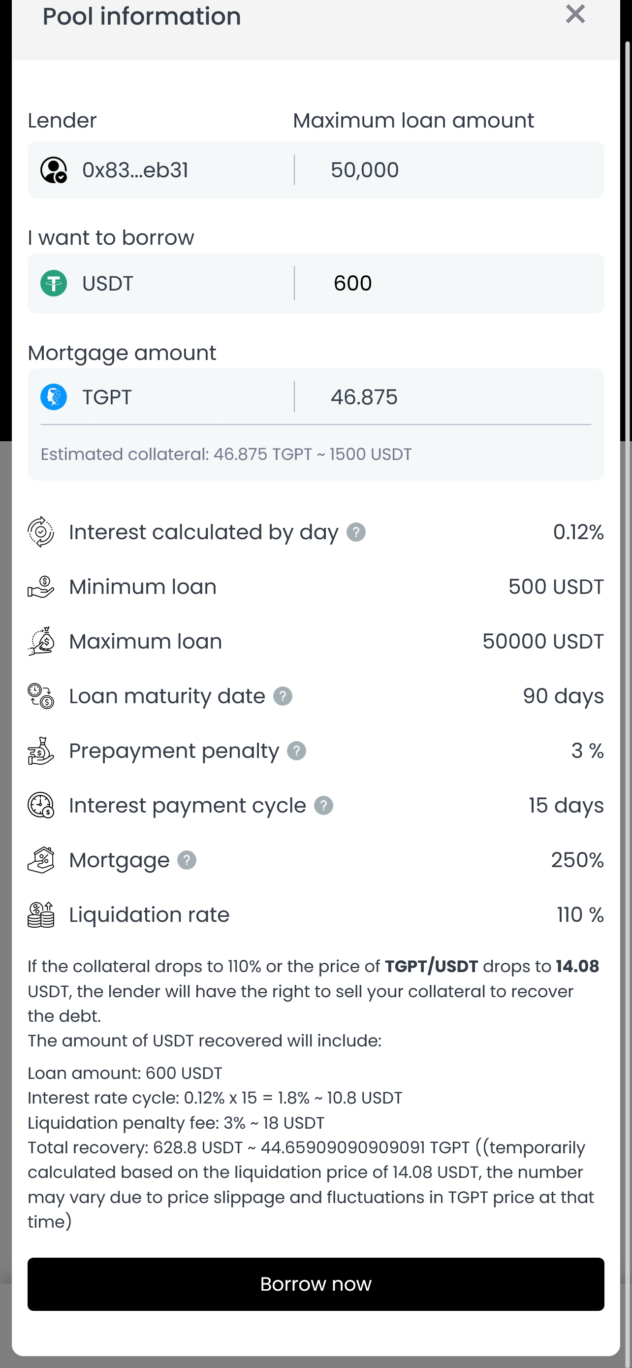 Fill in the amount of USDT you want to borrow and the system will automatically calculate the amount of TGPT you need to mortgage.