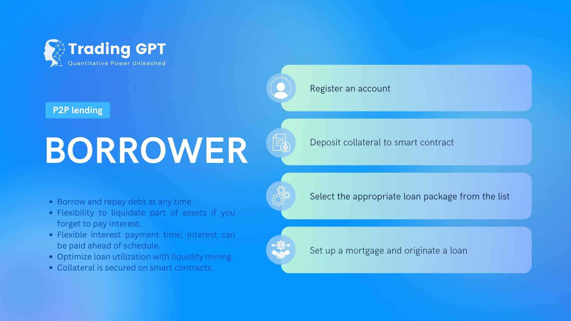 Pledging your crypto assets to borrow USDT has never been simpler at TradingGPT. Assets accepted for collateral include TGPT, Bitcoin, ETH, BNB, LINK, ARB, and many other censored crypto assets.