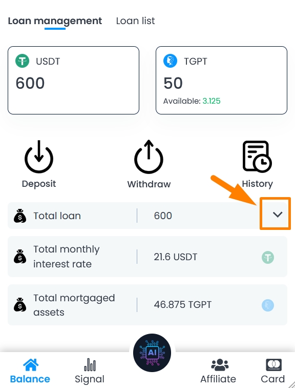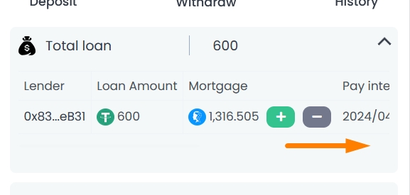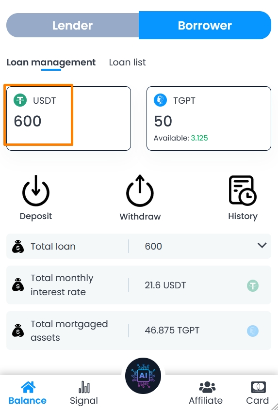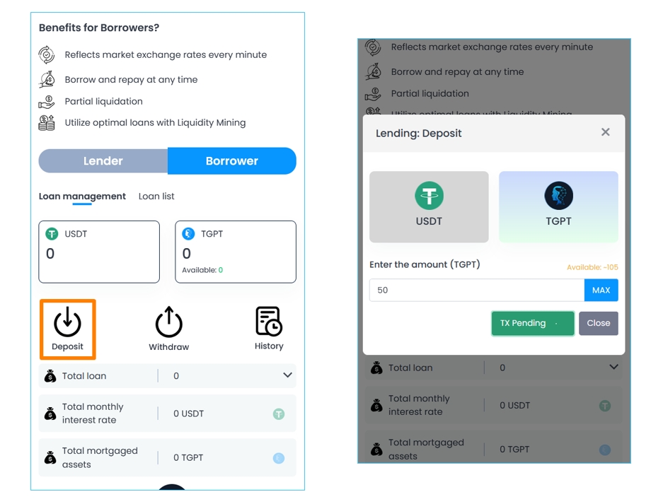 Deposit the amount of TGPT you want to mortgage to borrow USDT.