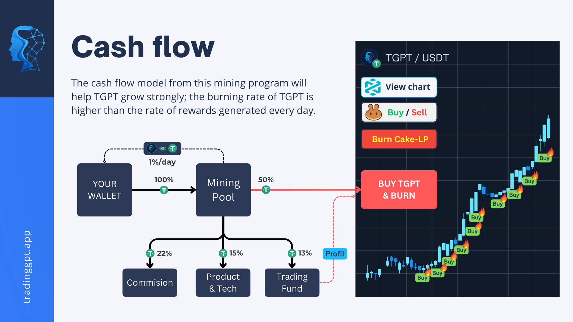 When there is 1 person participating in mining 1000 USDT, the MiningPool smart contract will use 500 USDT (\~50%) to buy TGPT on Pancakeswap and burn it immediately. Below is the cash flow allocation ratio in the TGPT Liquidity Mining model:&#x20;