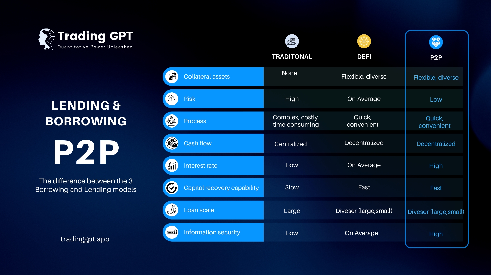 When it comes to lending and borrowing, people often consider traditional banks, decentralized finance (DeFi), and P2P platforms. Each model has its own features and advantages, but let's compare them side by side: